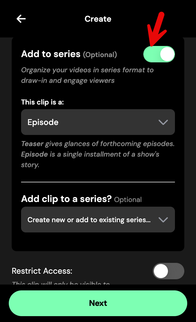 - Toggle Add to Series and select a video label - Episode, Teaser, Promo, or Sponsored.