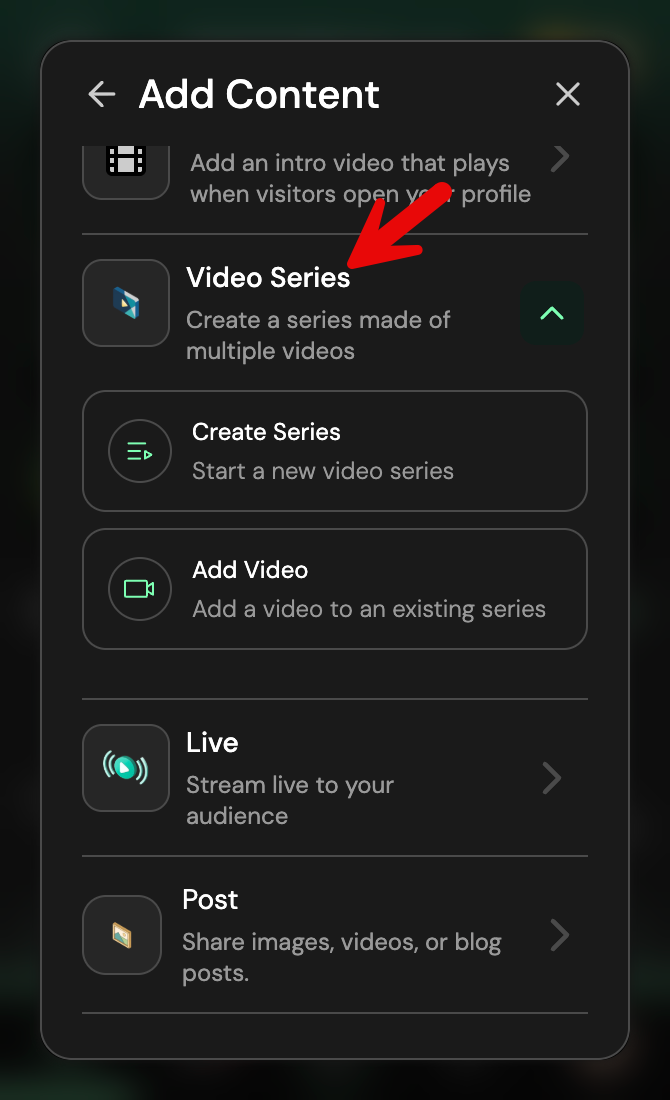 Add Video to upload a video to an existing series - If you select Add Video, choose how you want to upload: