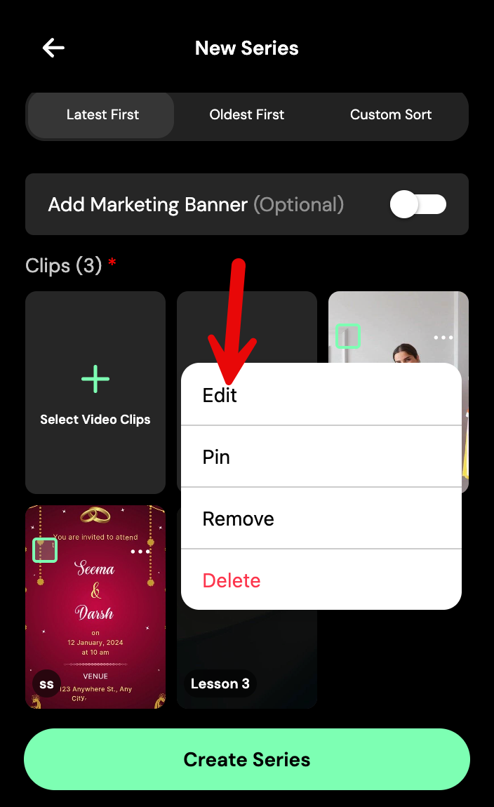 Tap the three-dot icon on any video to pin it, start a new chapter, or remove it from the series.