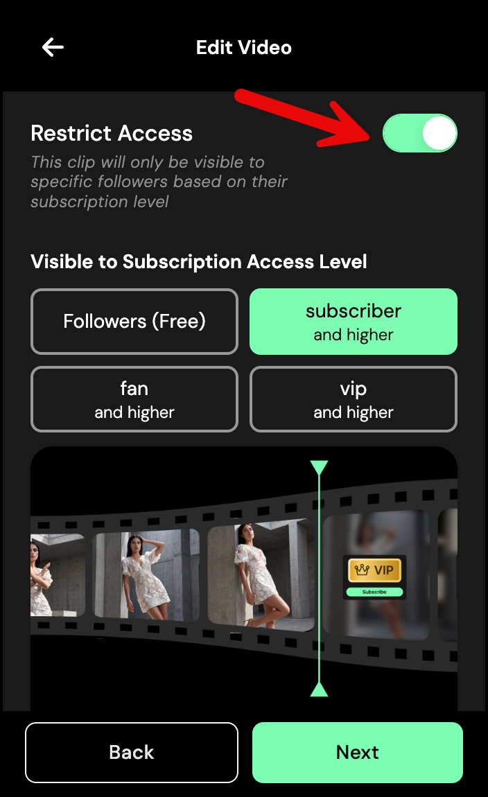For new uploads, you’ll see the restrict option during the upload process - select the subscription tier, set a preview time, and mute audio if needed.