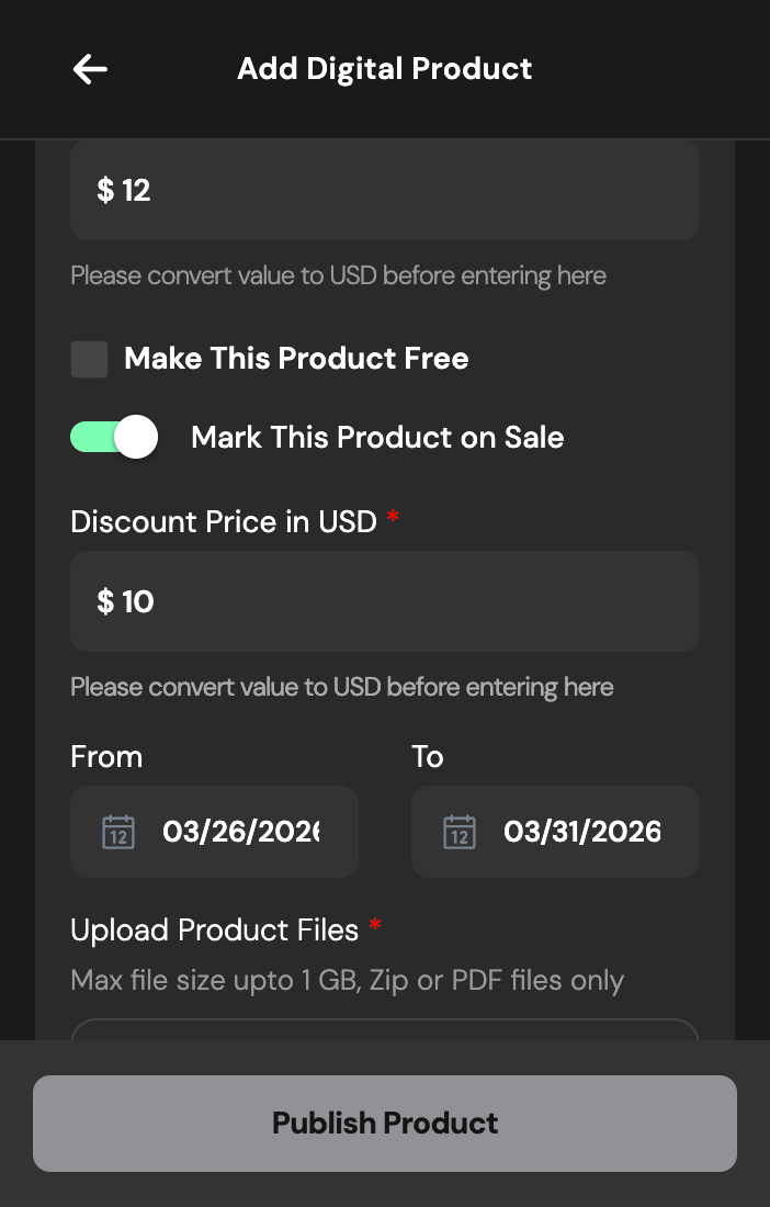If you’ve set a price and want to offer a discount, toggle Mark This Product on Sale. Enter your discounted price and select a start and end date for your sale.