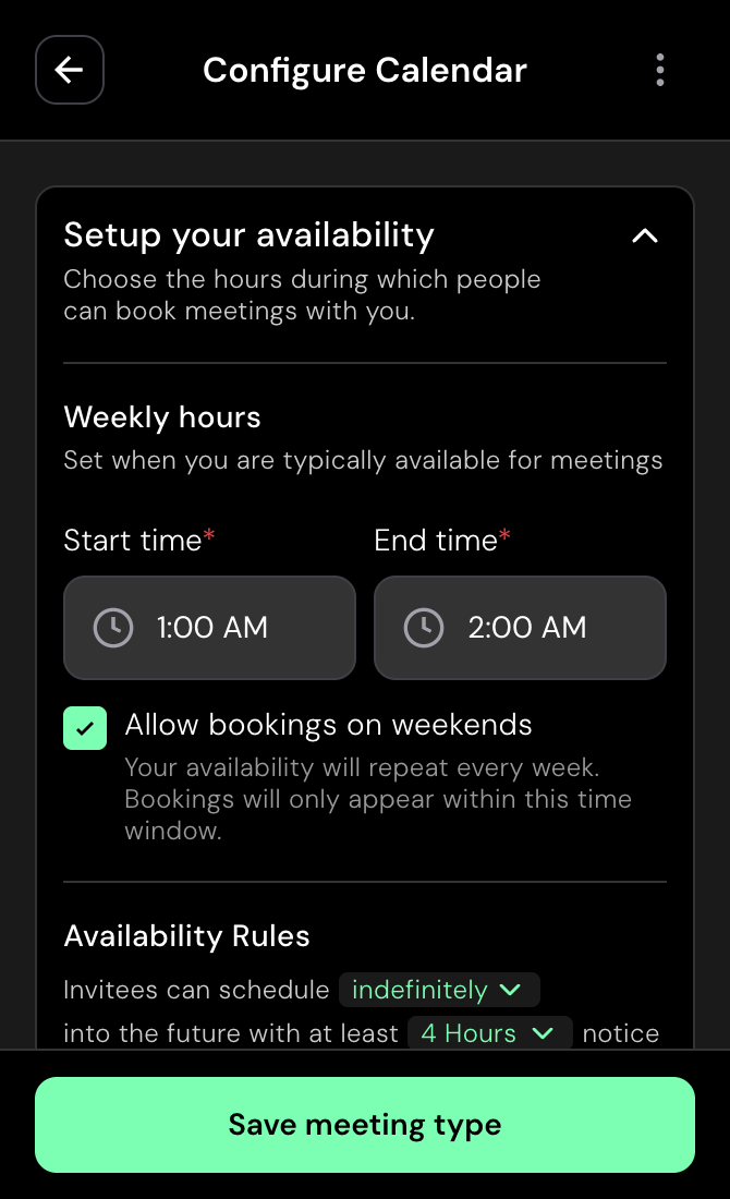 Note: You only need to do this once, future sessions wonβt require re-connection. - Under Weekly hours, set your Start time and End time.