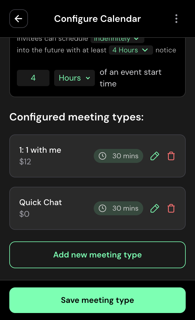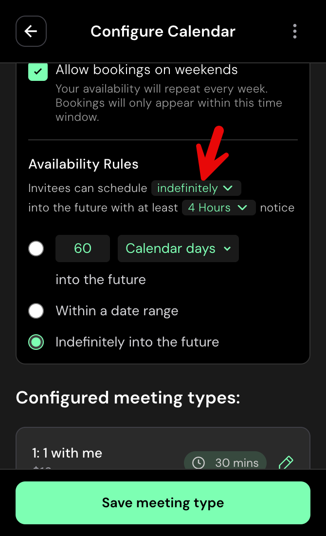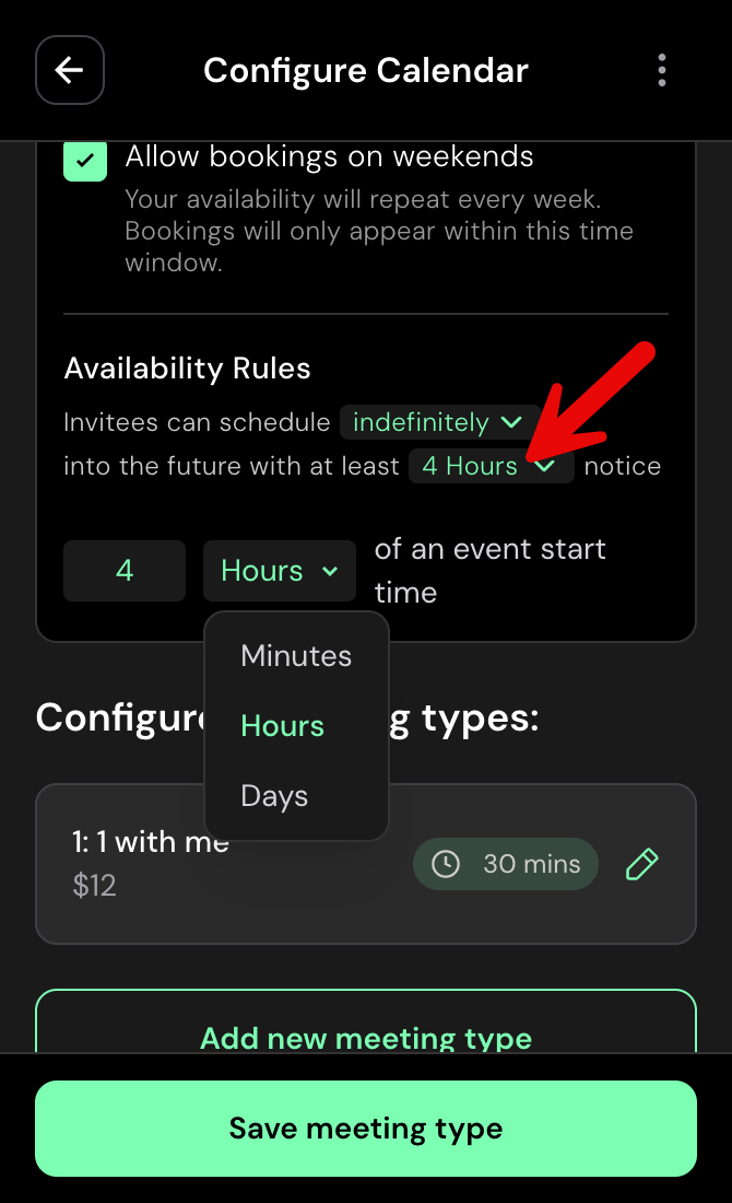 This means users must book at least that much time before the meeting start time, giving you enough preparation time. - Enter your Meeting topic (for example, 1:1 Fitness Coaching Session, Business Strategy Call, or Personalized Skincare Consultation).