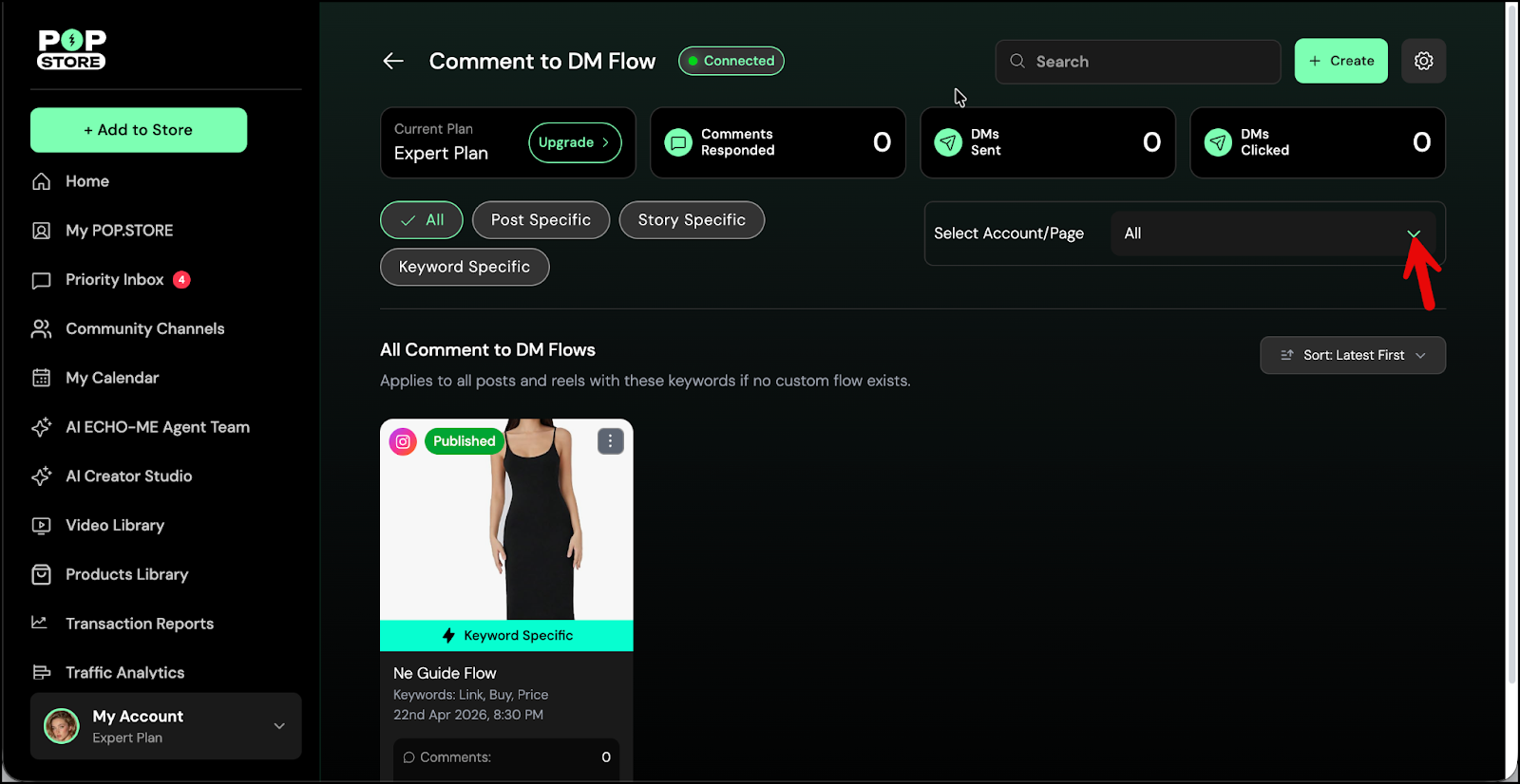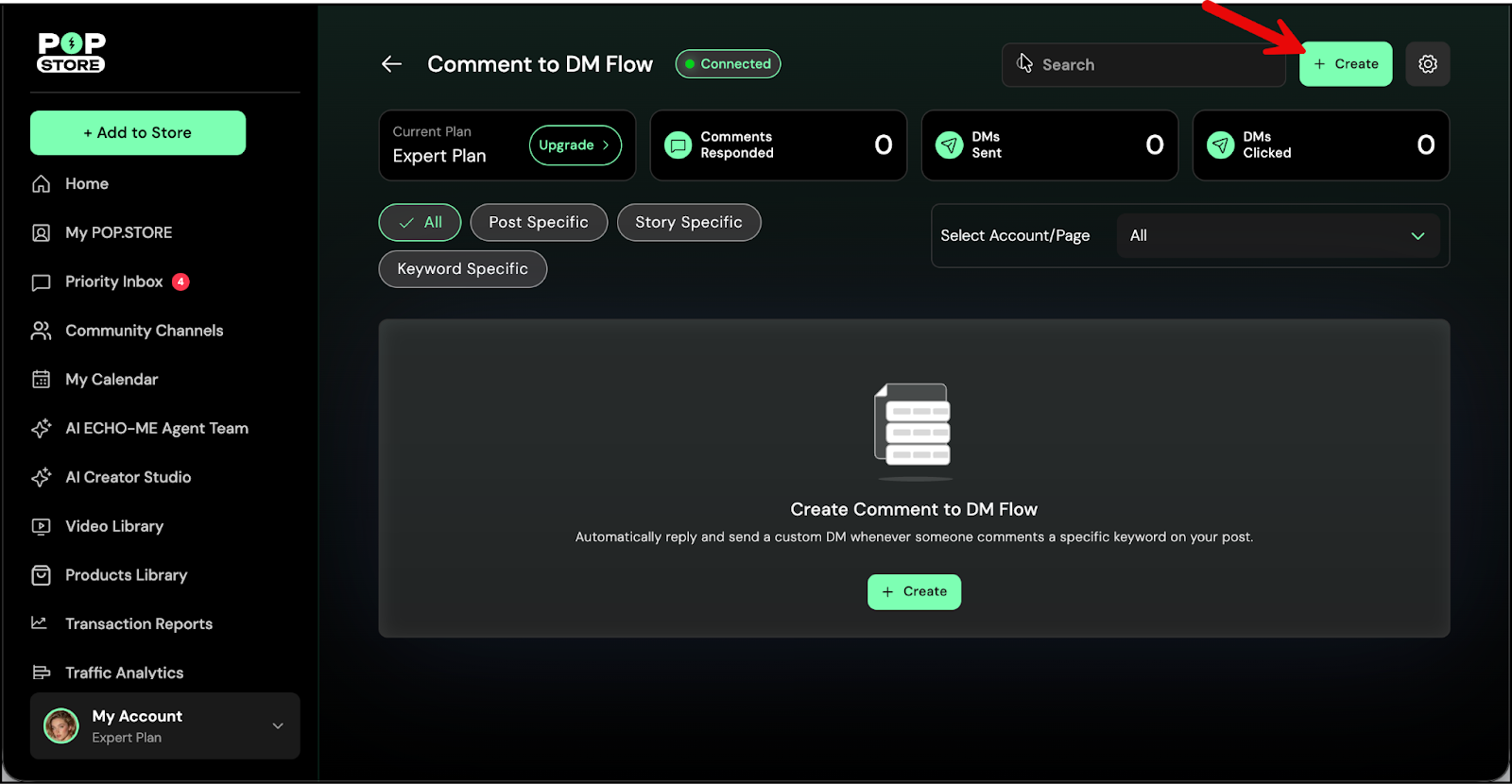 When you set up ECHO-ME Agent Team, your Meta accounts are already connected. Now it's time to create your Comment to DM flow. There are two ways to find the Comment to DM Agent: