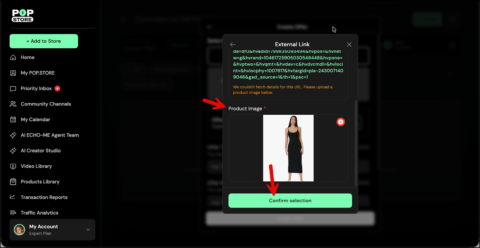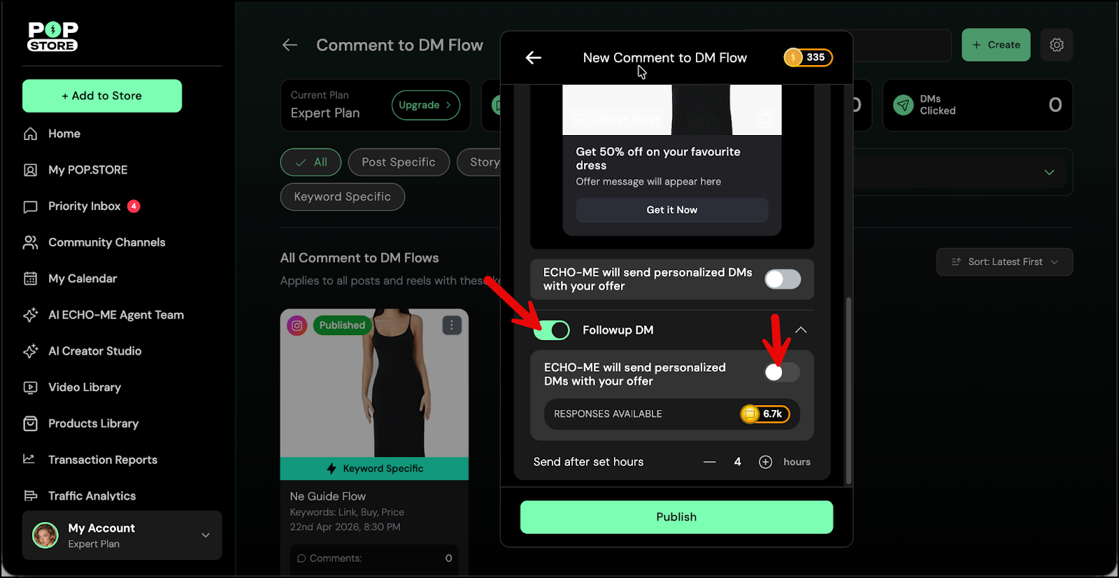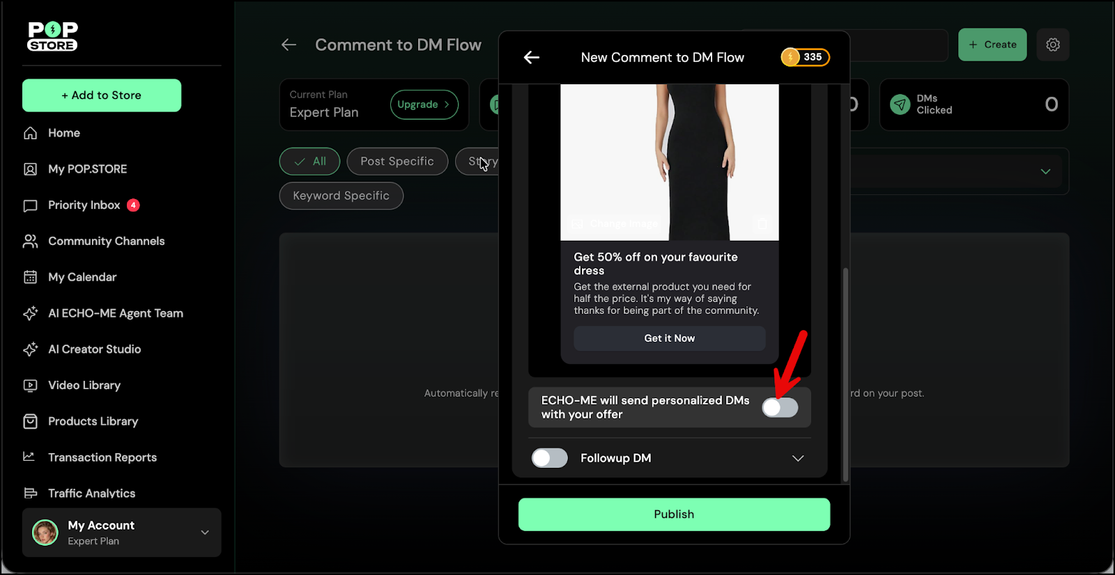 Once your offer is added, toggle ECHO-ME will send personalized DMs with your offer. If ECHO is not set up yet, you'll be redirected to complete the setup