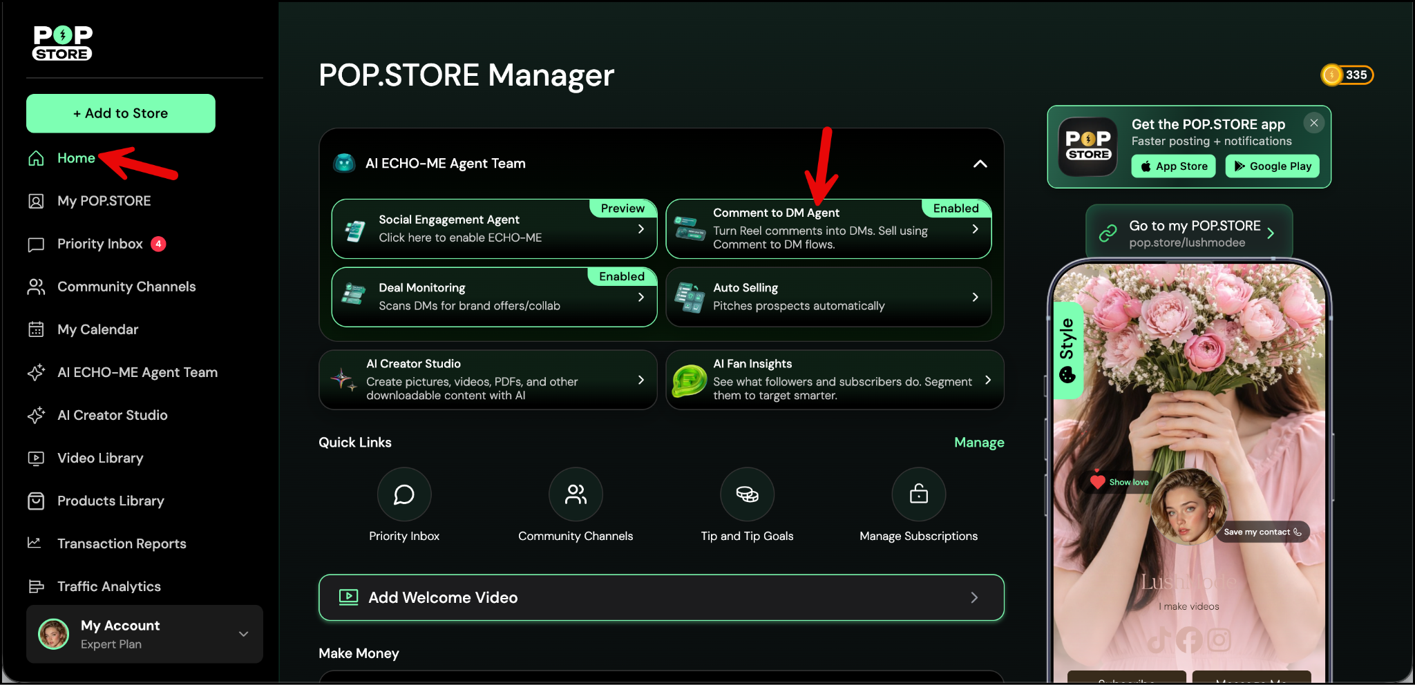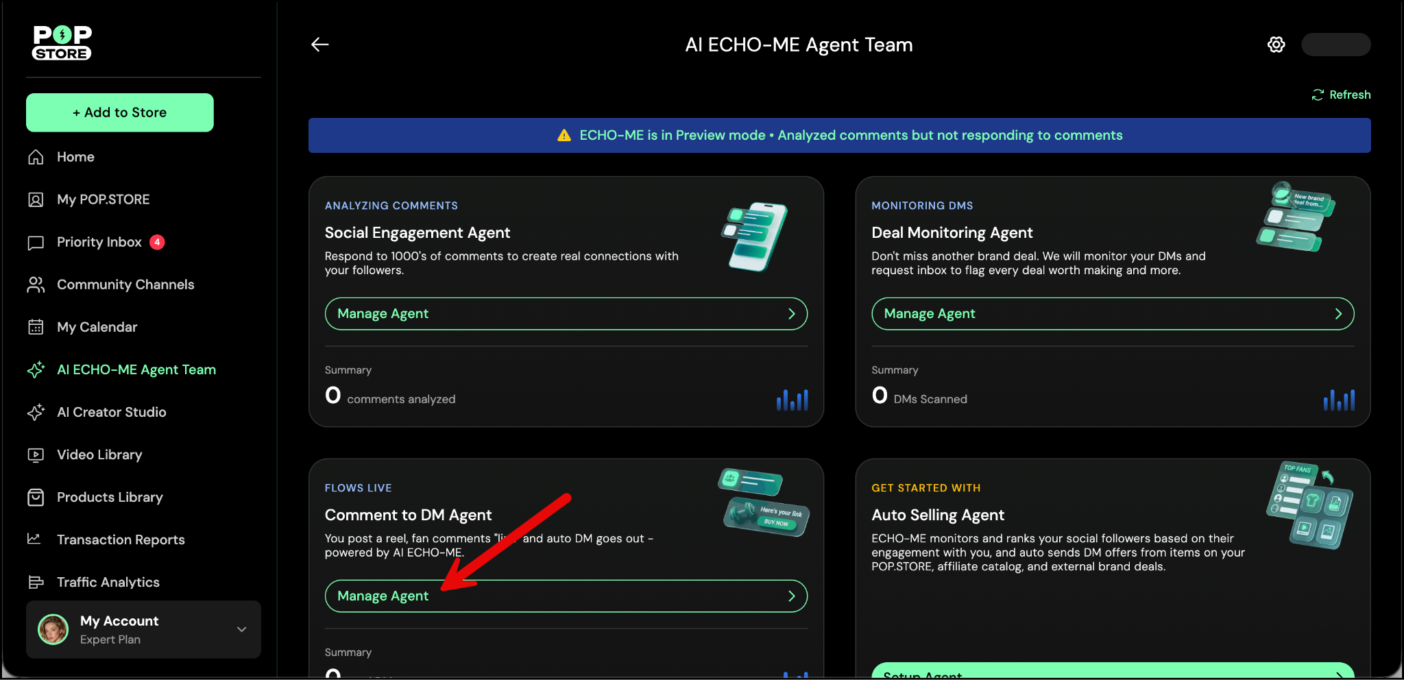 From either option, you'll land in the AI ECHO-ME Agent Team section. From there, in the Comment to DM Agent section, tap Manage Agent