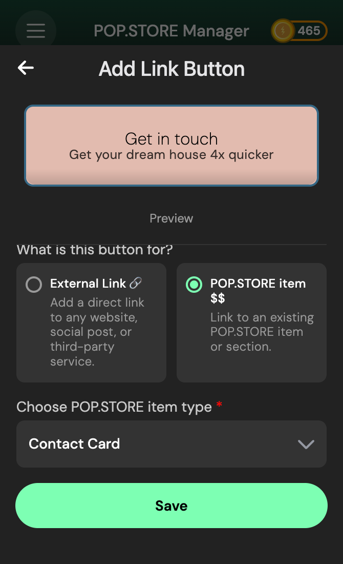 If you select POP.STORE Item, choose which section of your POP.STORE you want to send users to (such as a product, collection, or course).