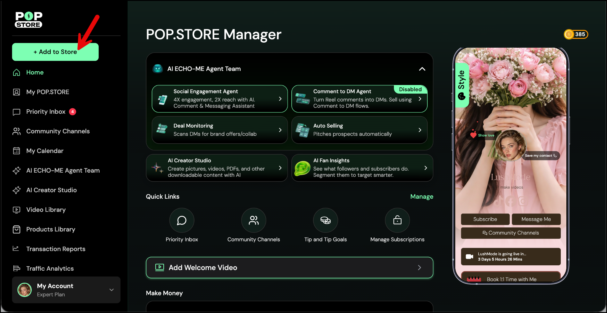 Want to sell your own merch? You can add your merchandise to your POP.STORE, create a full PDP, and sell it directly from your link-in-bio store.