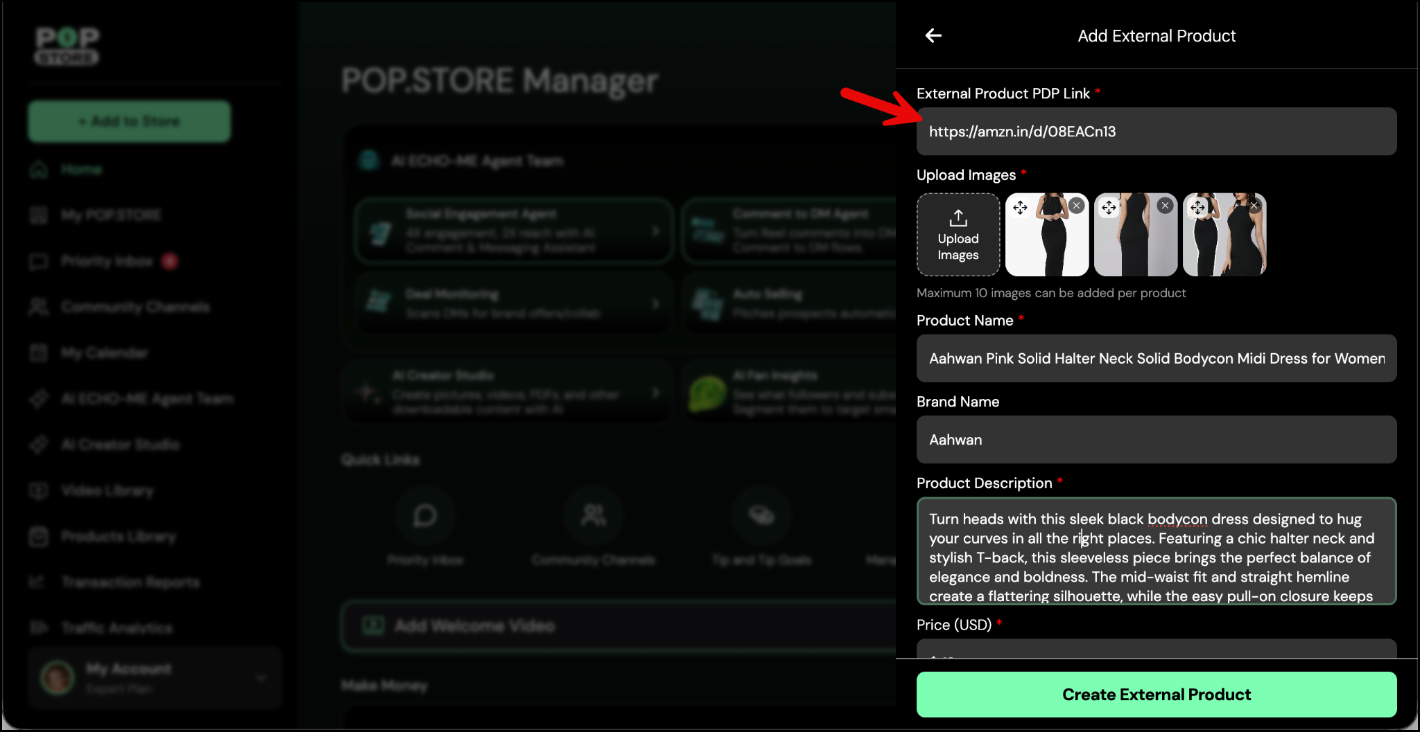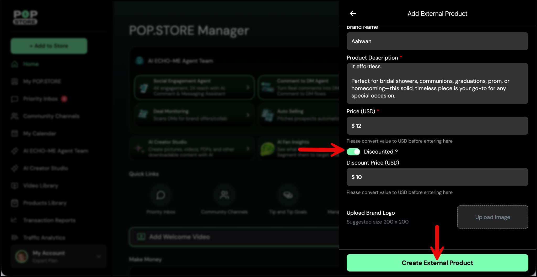 Note: External product purchases happen outside POP.STORE, so inventory or order tracking won't show in your dashboard.