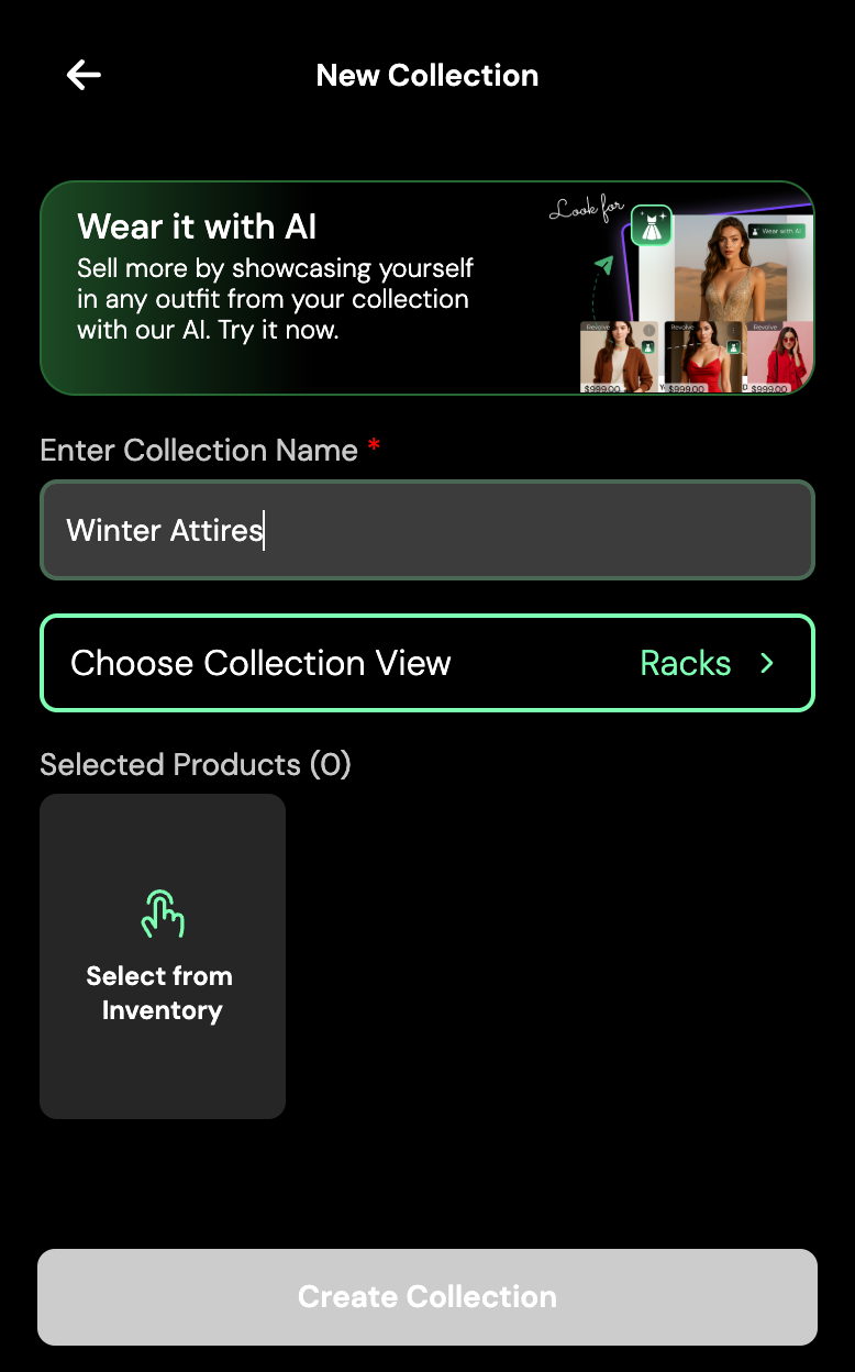 - From your profile, scroll down to the My Store section and tap + Add New Collection.
