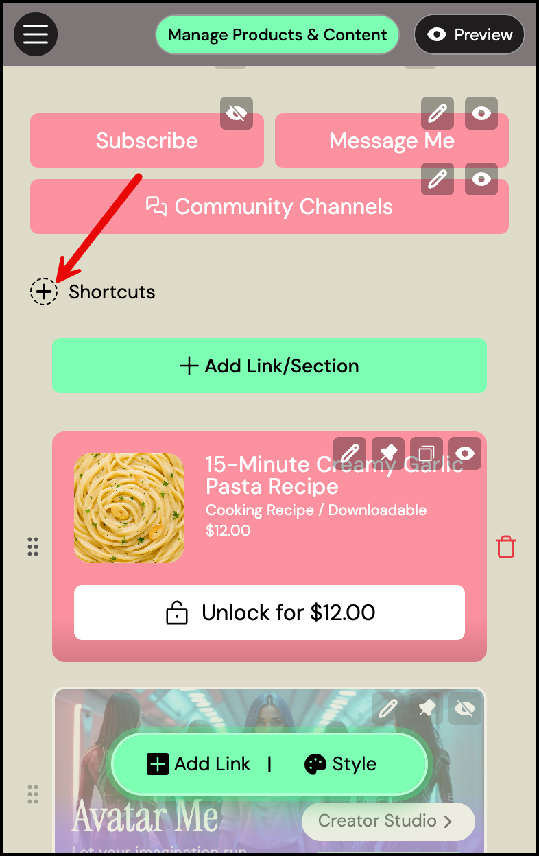 Shortcut buttons appear at the top of your profile and are a great way to highlight any specific section of your pop.store - like any custom button, Avatar Me button, your My Life, or My Store tab. It helps your followers quickly reach what matters most.