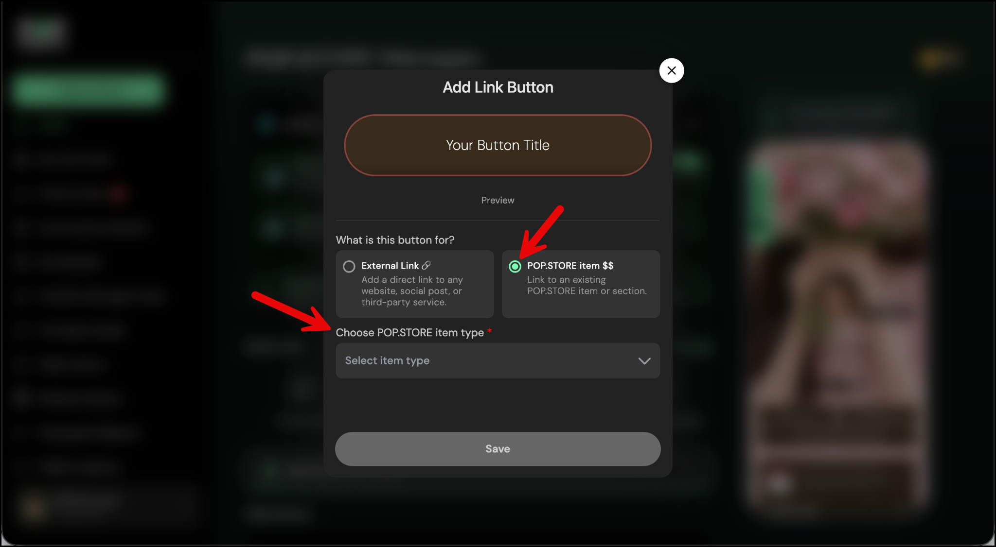 Select POP.STORE Item to link the button to an existing item or section within your POP.STORE.