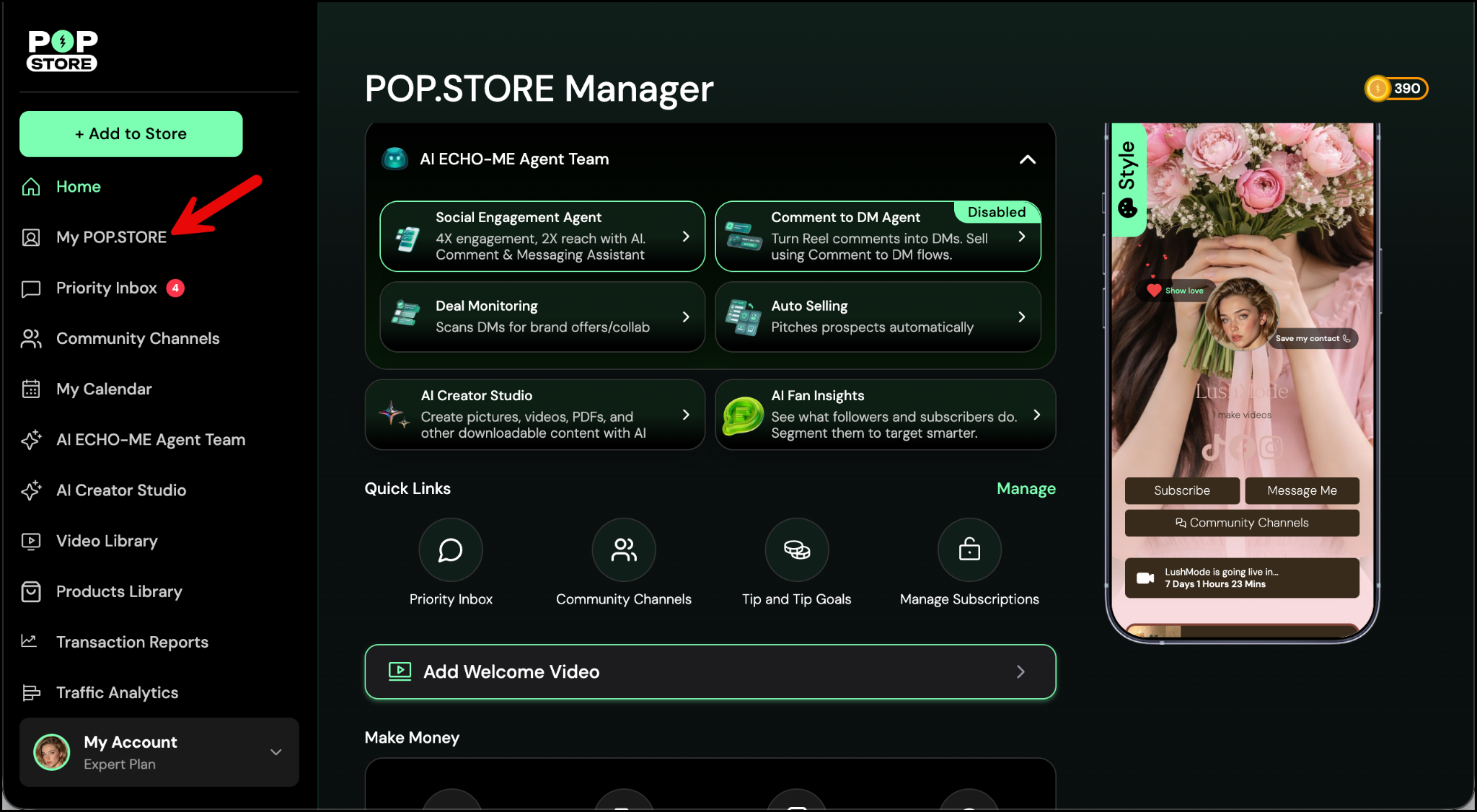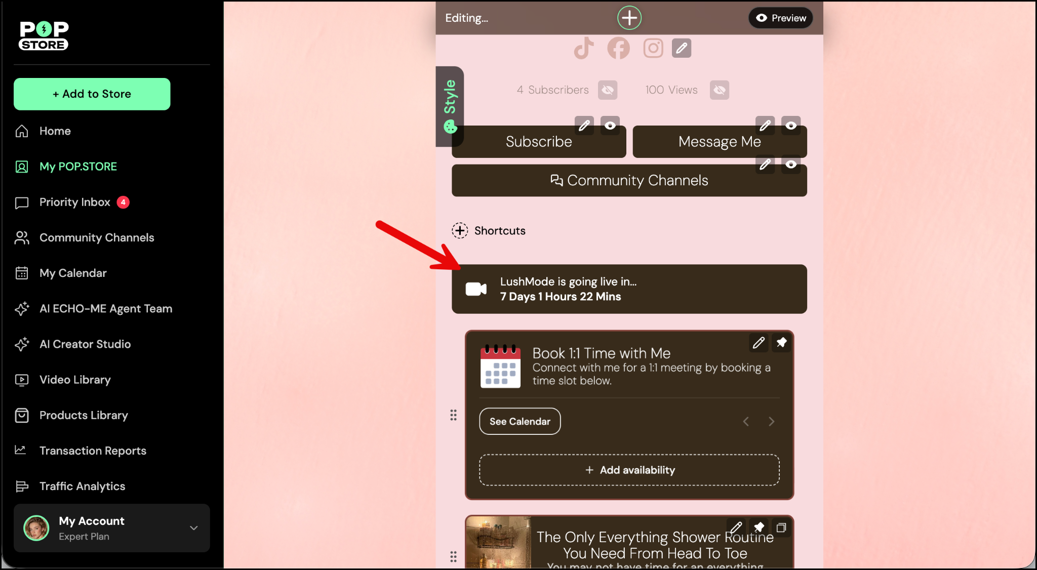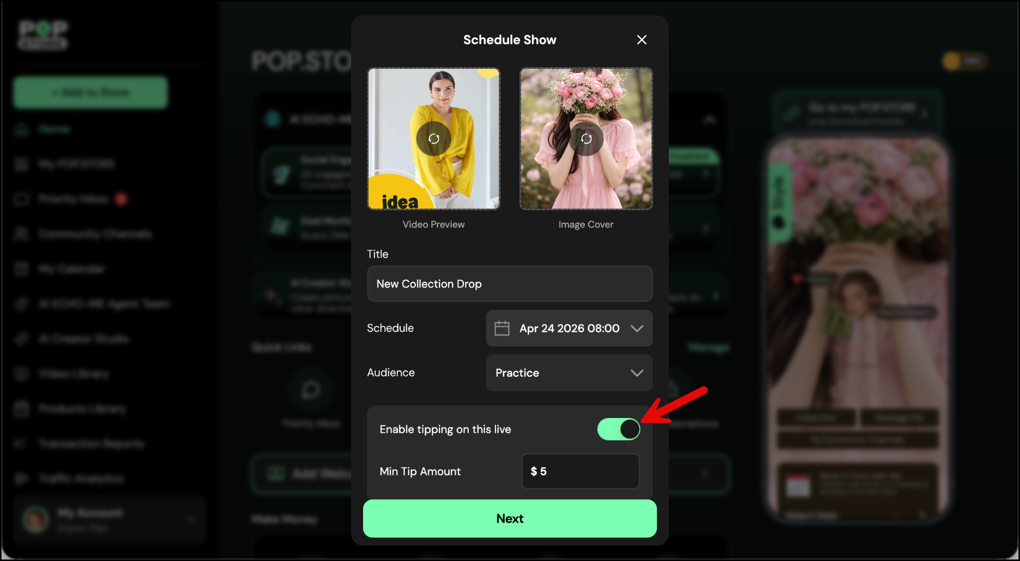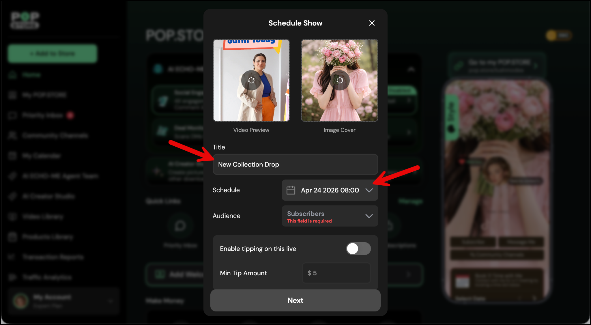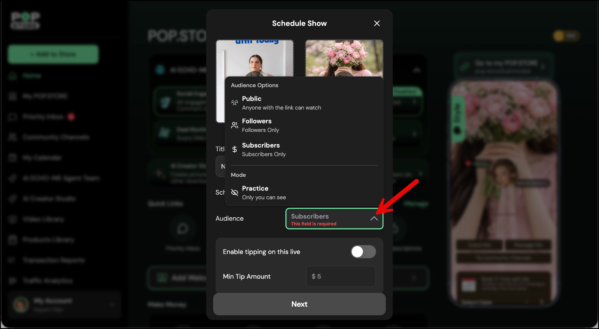 If you exit this screen, go to the left panel and select My POP.STORE to open your profile. Then tap on the scheduled live show button and tap Go Live to start your live.