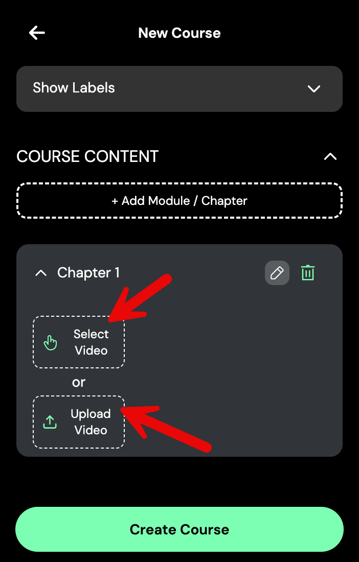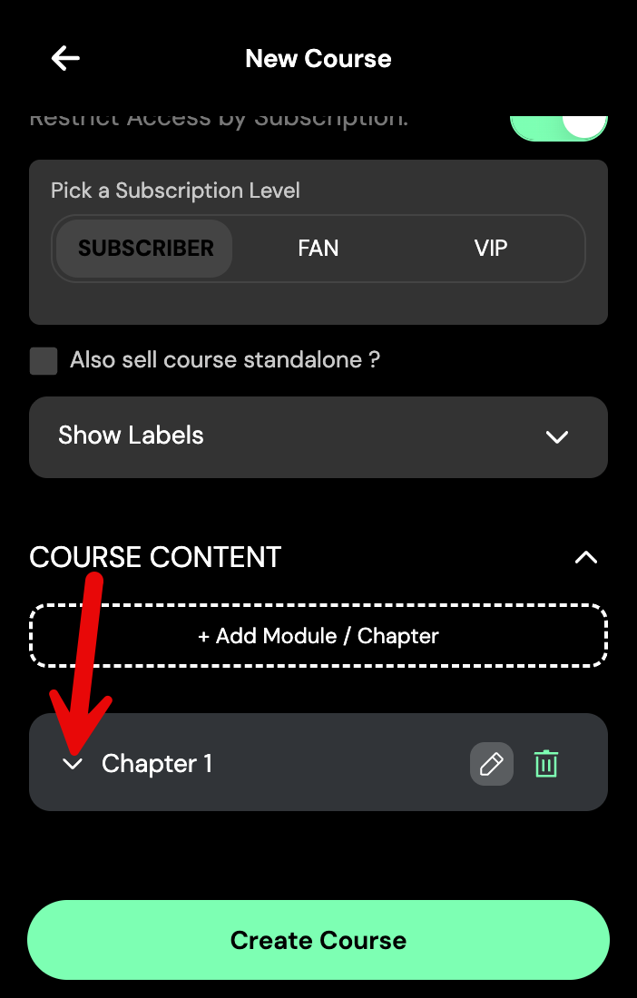 To add videos to your chapter, use the dropdown beside your chapter to expand it.