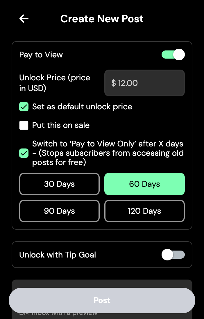 Choose a timeframe (30, 60, 90, or 120 days). After that, even subscribers will need to pay to unlock the post.Pro Tip: Great for earning from older content without keeping everything behind a paywall from day one. -