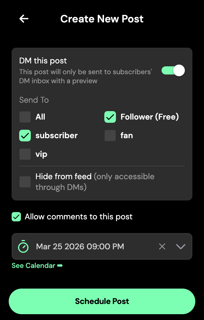 Want to share image galleries, videos, or long-form blogs with added control? With Post Exclusive Content, you can upload, restrict, price, and schedule your posts, and even DM your post directly to subscribers - all in one place. Perfect for subscriber-only updates, gated content, and limited-time drops.