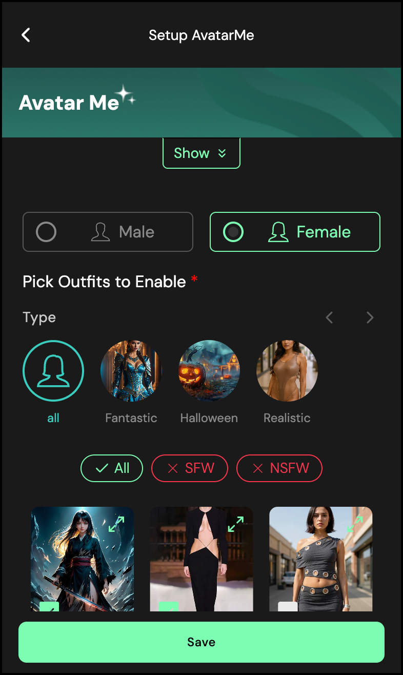 Pick Outfit Types: Choose from Fantastic, Halloween, or Realistic. You can even select from SFW (Safe for Work) or NSFW (Not Safe for Work), or just choose All to allow every type.Choose Avatars: Select the styles fans can generate.