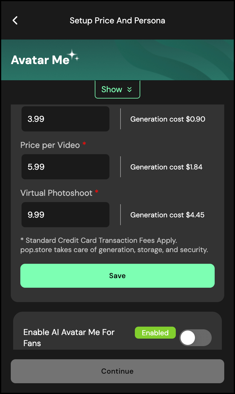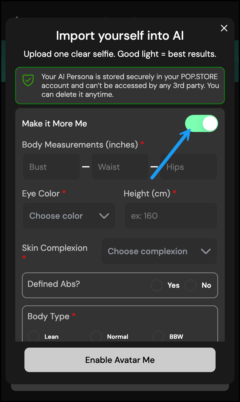 Tap Save and then toggle Enable AI Avatar Me for your profile. -