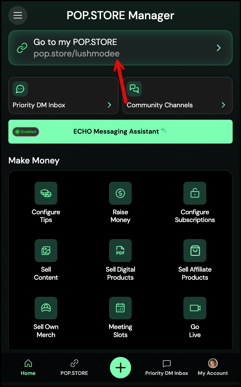 - From the Home screen, tap Go to my POP.STORE to open your Profile.