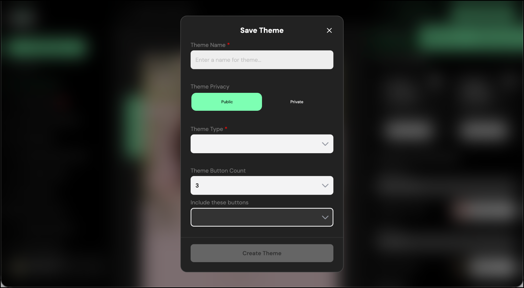 Once you’re happy with your design, tap Save Theme to save these settings as a theme. After tapping, give your theme a name, choose the theme privacy (public or private), select the theme type, and specify the number of buttons included. Then, from Include these buttons, select the buttons you want to add. This allows you to save the theme for your own use or share it with others.