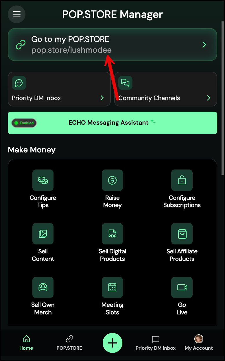 - From the Home screen, tap Go to my POP.STORE to open your Profile.