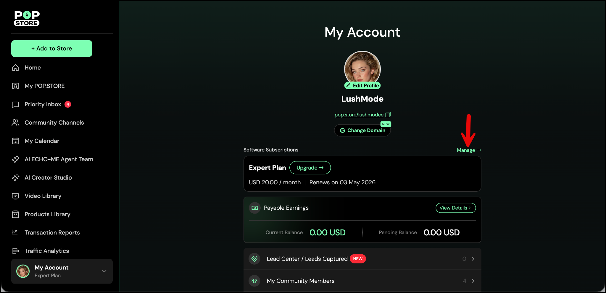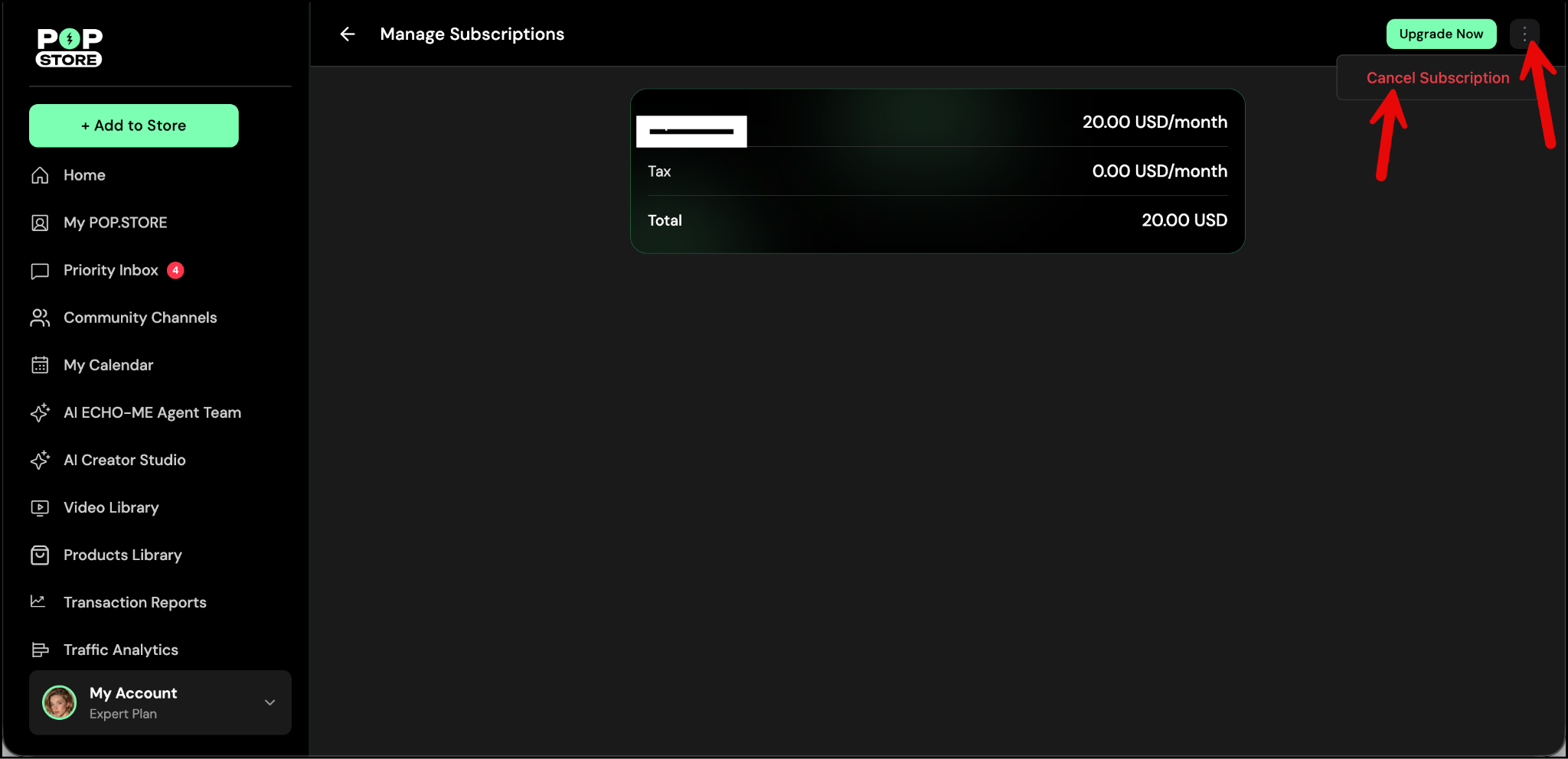 Note: If you are on the mobile app, you will not be able to manage or cancel your subscription from within the app. Please log in via a web browser to manage your subscription. You can log in here: POP.STORE
