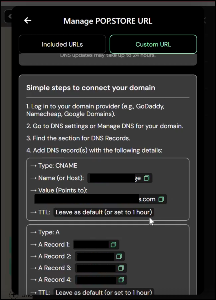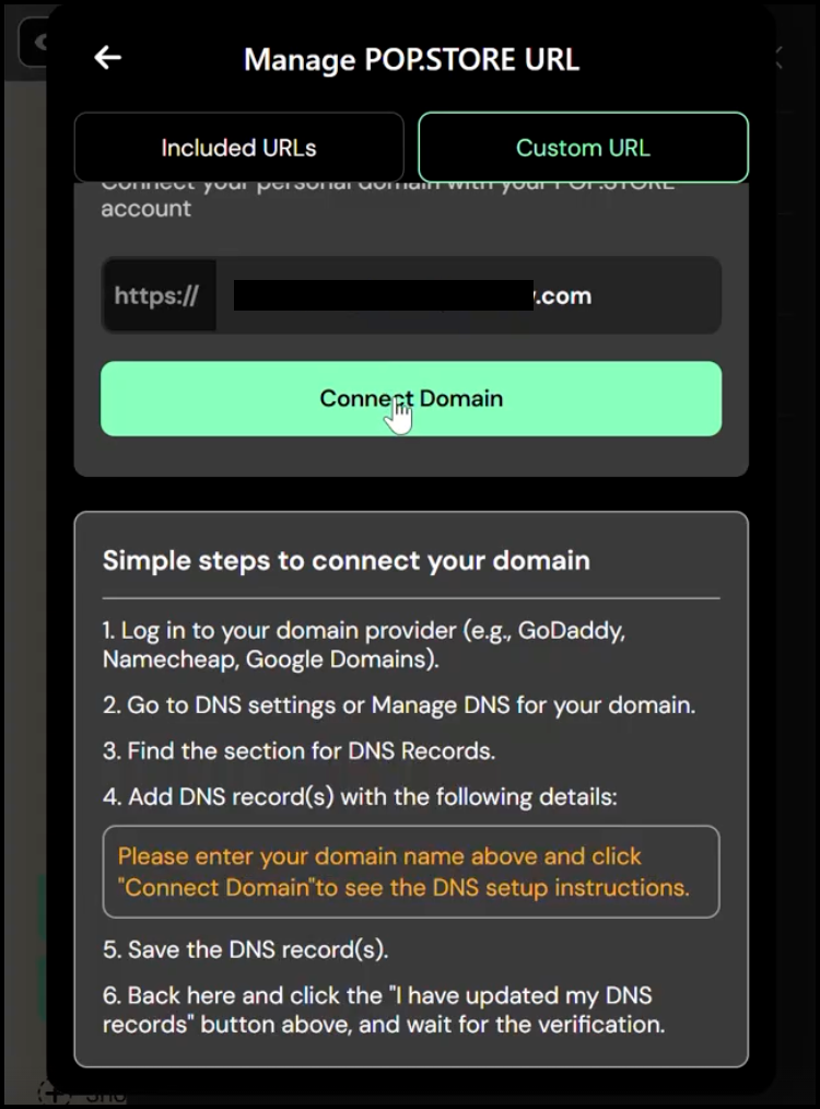 Once you do that, you’ll see a DNS setup guide appear on your pop.store screen.