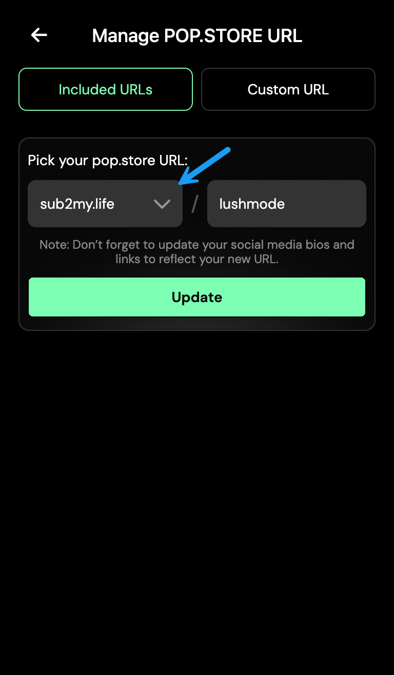 Note: You’ll get access to a few free domain options under the Included URL tab. To unlock more domains or connect your own custom domain, you’ll need to upgrade to our paid Expert plan. 👉 Not upgraded yet? Read this article to learn how to upgrade your pop.store subscription.