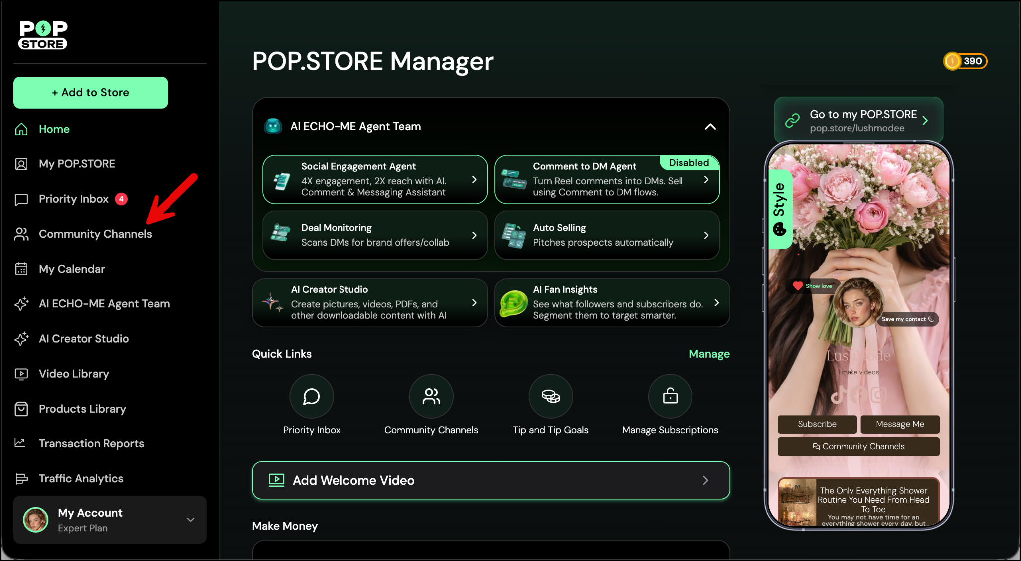 Want to stay connected with your fans in real-time? With Community Channel, you can create public or private channels inside your POP.STORE - perfect for sharing updates, starting conversations, or even just vibing with your closest fans.