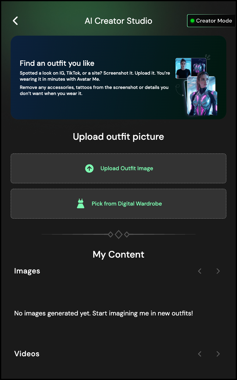 That’s exactly what the AI Creator Studio is for. Just upload an outfit, pick a scene, and boom - you’ve got an image or video of yourself in that style, ready to share with your followers. Your fans can join in too - generating looks you’ve approved, so the fun doesn’t stop with just you.