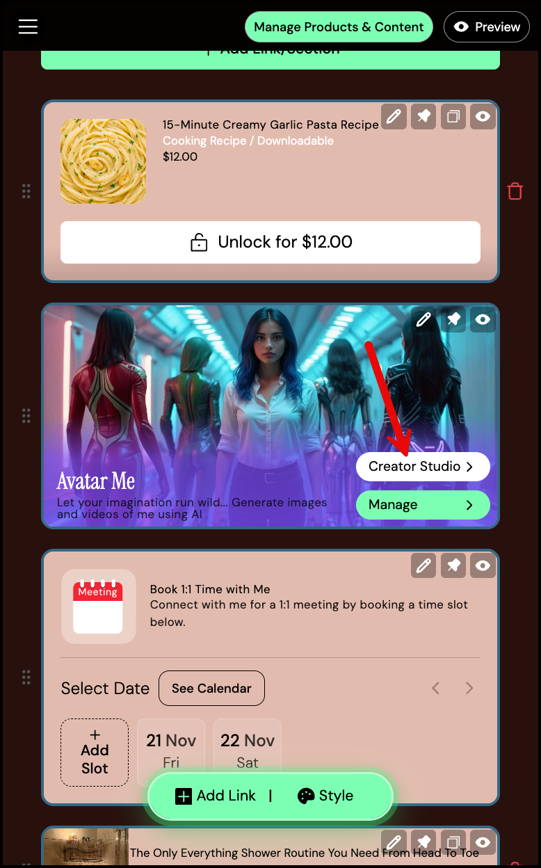 - Scroll down, find your Avatar Me button and tap Creator Studio. This will take you into the Avatar builder flow.