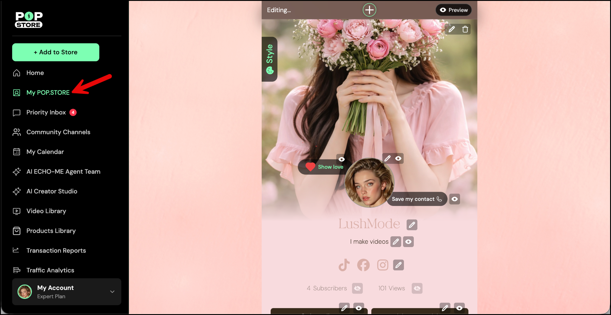 - From the left panel, select My POP.STORE to go to your profile.