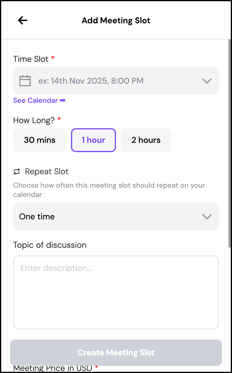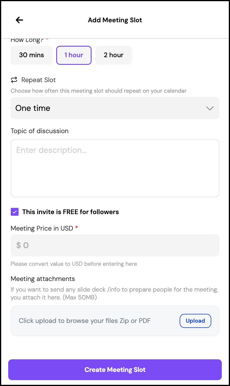 Tap Create Meeting Slot to publish.