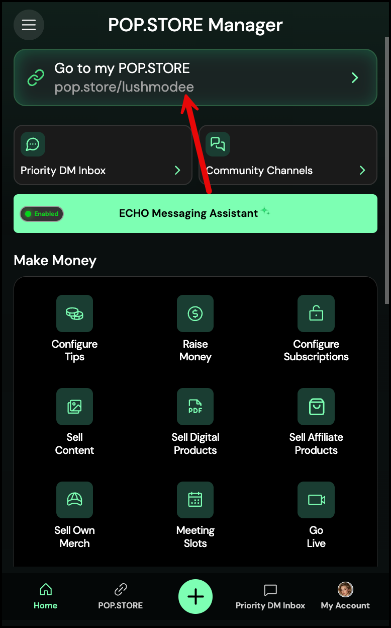 - From the Home Screen, tap Go to my POP.STORE to open your Profile.