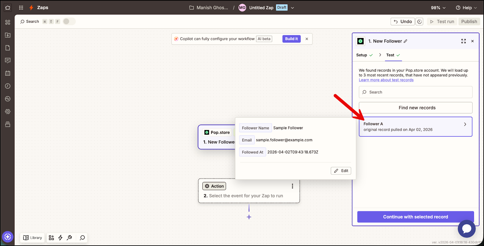 Zapier will pull sample data (like name, email, etc.) from your POP.STORE.