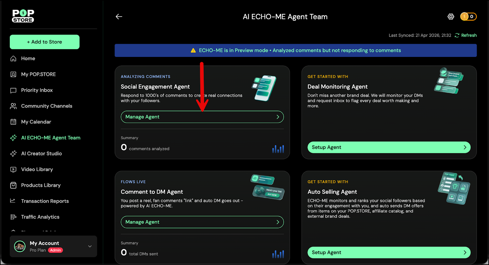 From either of these options, you will be taken to the AI ECHO-ME Agent Team section. From there, in the Social Engagement section, tap Manage Agent.