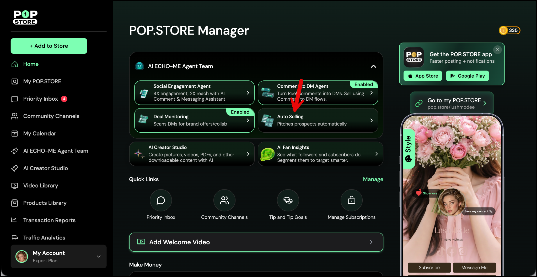 From either of these options, you will be taken to the AI ECHO-ME Agent Team section. From there, in the Auto Selling Agent section, tap Set Up Agent.