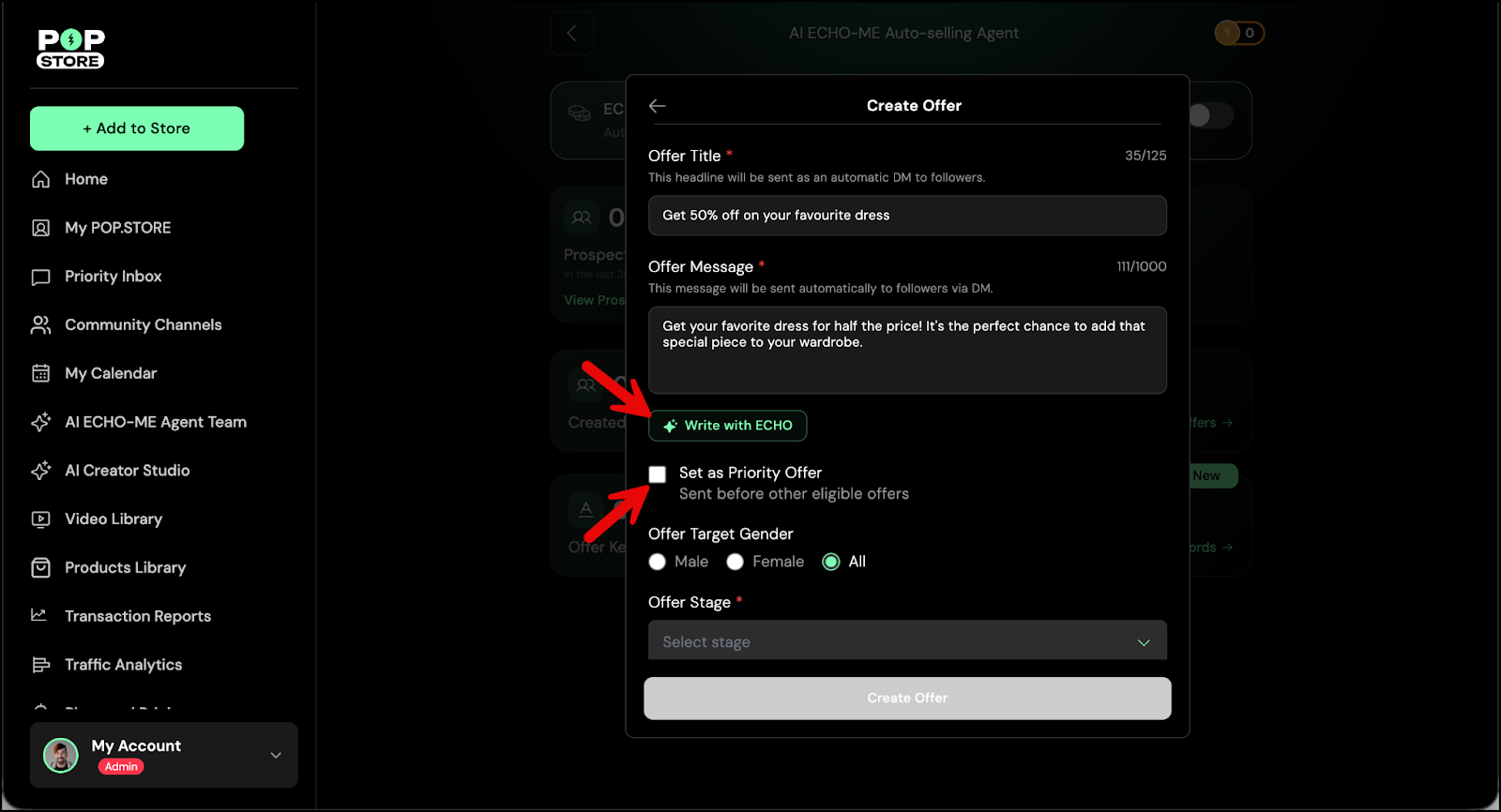 Tick Set as Priority Offer. This ensures this offer is sent before other eligible offers. Use this when you want to push a specific product or campaign first.Target Gender. Choose who should receive this offer (Male, Female, or All).