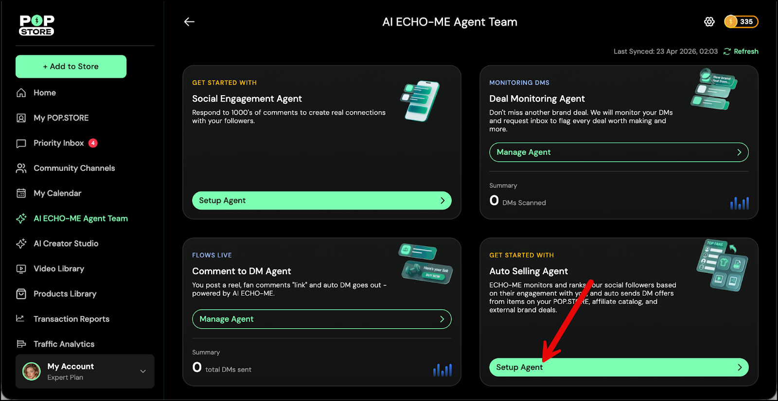 Before you start: If you haven't set up your ECHO-ME Agent Team yet, complete that first. Once done, you can start configuring Auto Selling Agent.